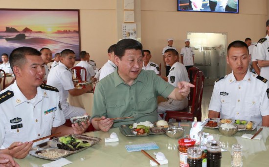 2013年4月9日,习近平在海军驻三亚部队水兵餐厅同水兵们共进午餐。 李刚摄